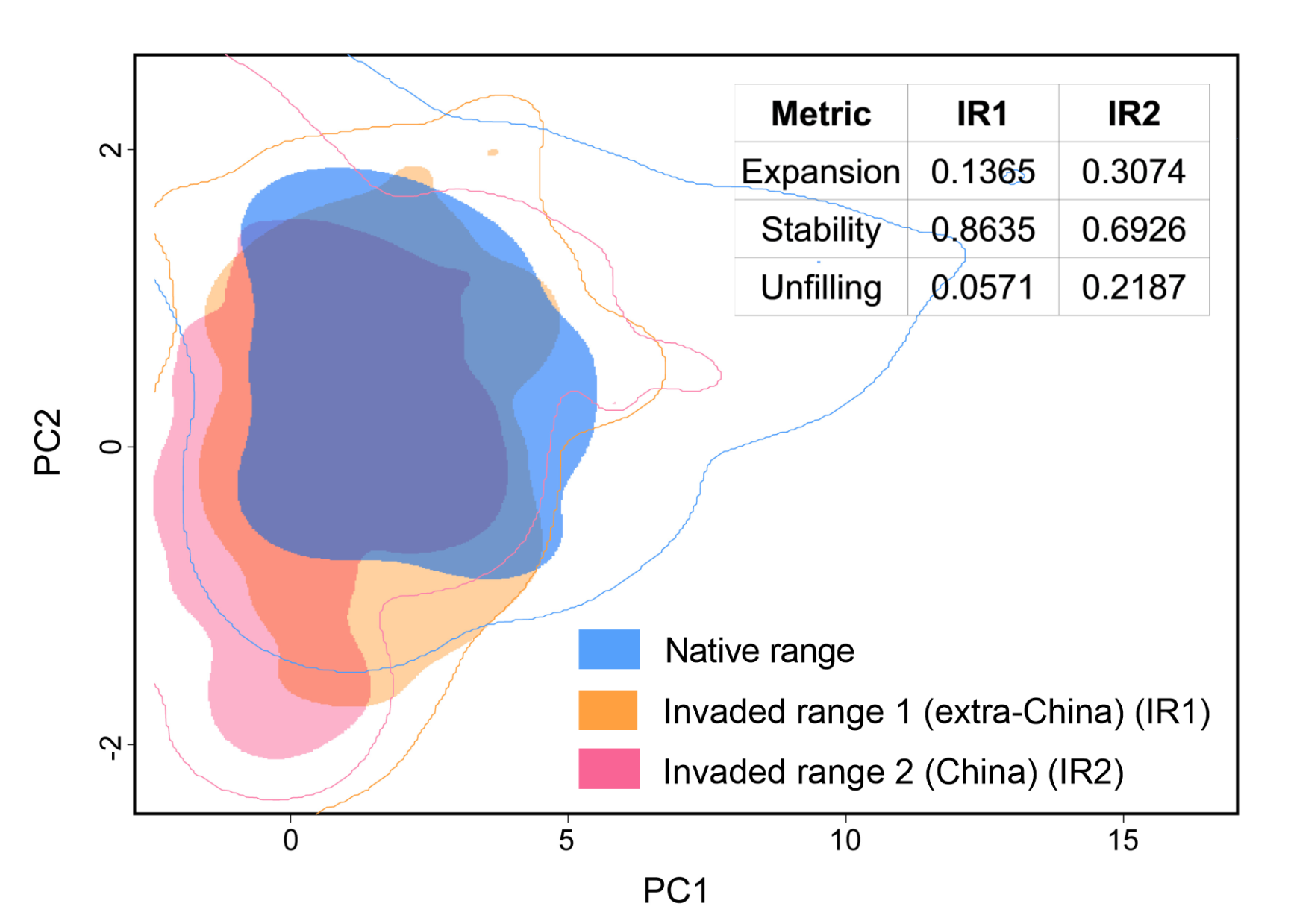 图2. 番茄潜叶蛾的气候生态位动态分析