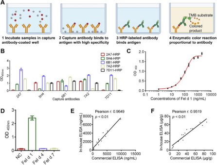 应用该方法检测猫唾液与毛发样本,结果与商业化检测试剂盒具有高度一致性(相关系数r > 0.95)。研究还通过表位鉴定揭示了2A7与6B1抗体识别的两处关键α螺旋结构区域,为后续Feld 1功能研究与疫苗设计提供了结构依据。该研究不仅为猫过敏原的定量检测提供了国产替代方案,也为建立宠物致敏物暴露监测体系奠定了技术基础。