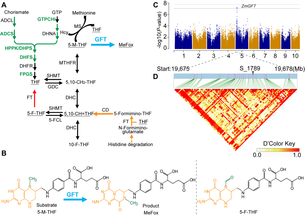 叶酸是一种水溶性B族维生素,其摄入不足往往会诱发高血压、胎儿神经管发育缺陷等一系列疾病。通过分子标记辅助高叶酸作物育种能快速有效地实现叶酸生物强化,有效改善叶酸缺乏症状。研究团队通过全基因组关联分析发现编码玉米谷氨酸亚胺甲基转移酶的ZmGFT基因第682位碱基存在A/G自然变异,导致蛋白第228位甘氨酸变为天冬酰胺,显著影响玉米籽粒中活性叶酸的积累。基因敲除和过表达技术验证了ZmGFT功能缺失后,玉米籽粒中活性叶酸含量显著提高。该研究结果不仅揭示了ZmGFT在植物叶酸代谢中的新分支途径,还提供了可直接利用的优良等位基因资源及其分子标记,为培育高叶酸功能性玉米提供了新的理论基础和应用思路。