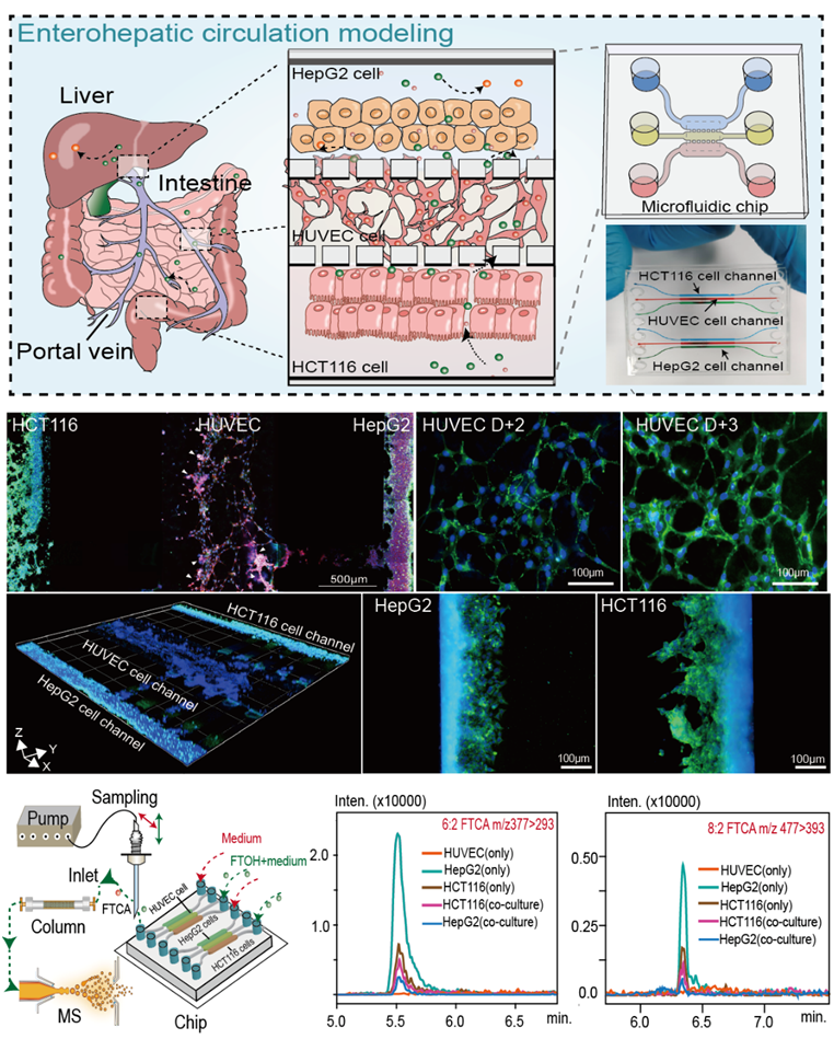 该研究针对传统动物模型周期长和器官作用的时空成像及监测难等问题,利用微流控芯片上组织细胞微环境和流体时空动力学的精确控制和可预测性,开发了包括血管内皮细胞、肠上皮细胞和肝上皮细胞的3D器官芯片,实现精准调控细胞间物质传输和精确模拟肠-血管-肝通讯。与传统2D板上血管内皮的分散排列相反, 3D器官芯片上细胞形成致密的蜂窝状网络,具有更长的管状结构,更接近于真实器官组织。进而,利用芯片与固相萃取-质谱系统相结合动态监测暴露于全氟化合物条件下肠-血管内皮-肝相互作用的代谢规律。开发的器官芯片—质谱毒理评价平台不仅为实时监测污染物代谢、转化和毒性作用提供了有力工具,也可用于药物开发和天然产物功能评价。