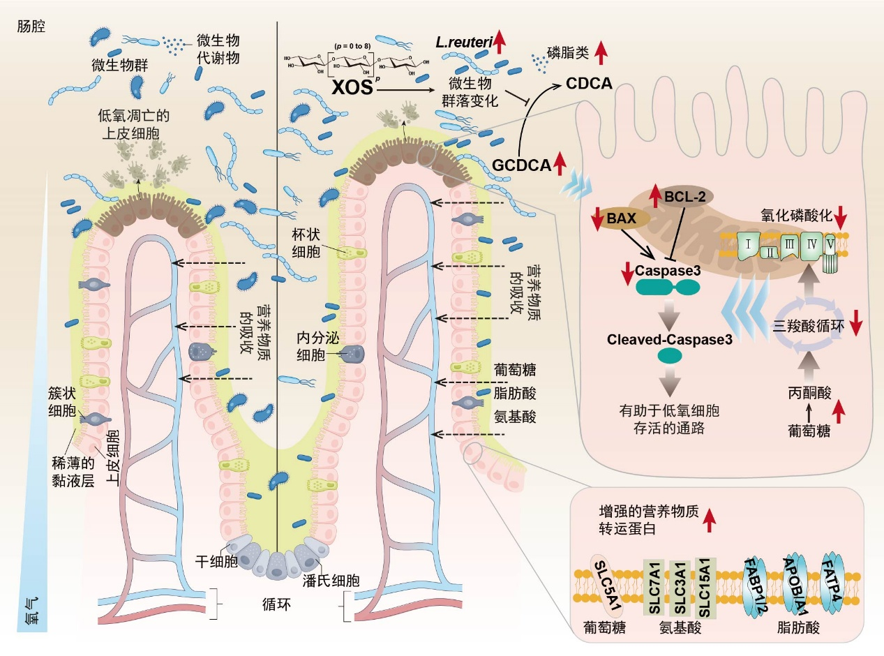 结果表明,日粮添加XOS通过提高空肠绒毛高度和增强肠道养分转运能力,改善了断奶仔猪的生长性能。深入机制研究发现,XOS并非通过促进细胞增殖,而是通过抑制空肠上皮细胞凋亡进而改善上皮细胞存活来发挥作用;该过程主要依赖于其降低细胞对氧的依赖。并且XOS在小肠中富集的L. reuteri是发挥这一功能的关键。在后续机制验证实验中,发现L. reuteri可缓解大肠杆菌(E. coli)注射引起的小肠细胞凋亡进程,且改善E. coli导致的仔猪体重下降。结合多组学联合分析及靶向代谢组学验证,明确了空肠食糜中胆汁酸甘氨鹅脱氧胆酸(GCDCA)积极响应XOS的添加与L. reuteri菌的富集;体外细胞实验进一步证实低剂量GCDCA抑制了低氧诱导的猪空肠上皮细胞凋亡。本研究揭示了XOS通过富集空肠L. reuteri,重塑了肠细胞能量代谢状态,抑制了低氧状态下肠上皮细胞凋亡进程的新机制,这为动物肠道健康精准营养调控提供了新思路。
