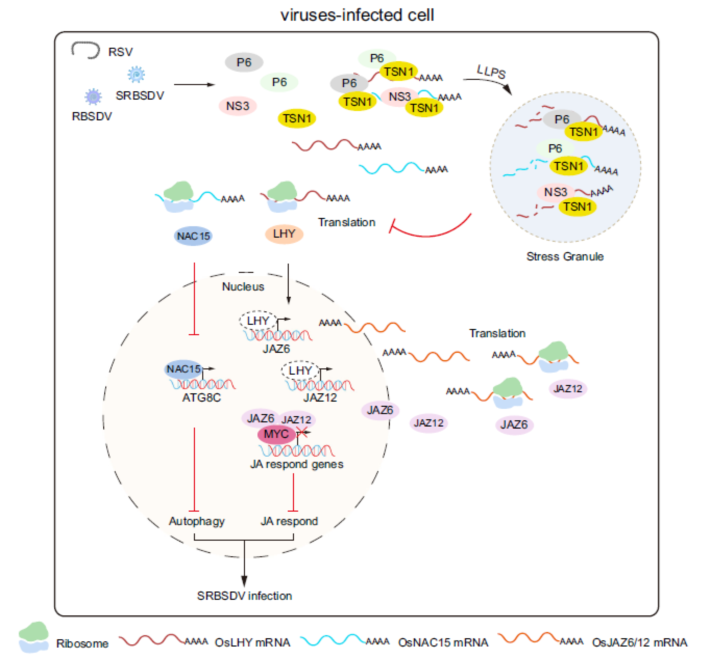该研究证实SRBSDV编码的P6蛋白在植物细胞质具有液-液相分离(Liquid-liquid phase separation, LLPS)的特性,免疫共沉淀串联蛋白质谱分析发现RNA结合蛋白OsTSN1在P6形成的液滴中高度富集,P6通过与OsTSN1互作促进后者发生LLPS,诱导形成定位于应激颗粒(Stress granules, SGs)内的P6-OsTSN1液滴,并且OsTSN1蛋白对P6-OsTSN1液滴的SGs定位起关键作用。遗传学实验结果显示,OsTSN1过表达水稻对SRBSDV的易感性增强,而OsTSN1敲除突变体对SRBSDV的易感性显著降低,表明OsTSN1负调控水稻的抗病毒免疫反应。进一步研究发现,OsTSN1能降解单链RNA,且其核酸酶活性与其多聚化程度呈正相关,而在P6-OsTSN1液滴中P6通过与OsTSN1相互作用促进其多聚化,从而显著增强OsTSN1的核酸酶活性。紫外交联免疫沉淀结合RNA-seq分析发现,OsTSN1特异性识别并结合含有GAGGAG基序的mRNA,其中OsNAC15和OsLHY转录因子的mRNA被P6-OsTSN1液滴显著富集并靶向降解。进一步研究证实,OsNAC15作为转录激活因子结合自噬相关基因OsATG8C的启动子区域并正调控其转录表达,而OsLHY作为转录抑制因子结合茉莉酸信号通路相关基因OsJAZ6/12的启动子区域并负调控其转录表达。此外,SRBSDV P6通过形成P6-OsTSN1液滴来特异性招募并降解OsNAC15和OsLHY的mRNA,抑制自噬相关基因OsATG8C的转录但增强茉莉酸信号通路相关基因OsJAZ6/12的转录,从而同时抑制水稻自噬和茉莉酸信号通路介导的抗病毒免疫反应。