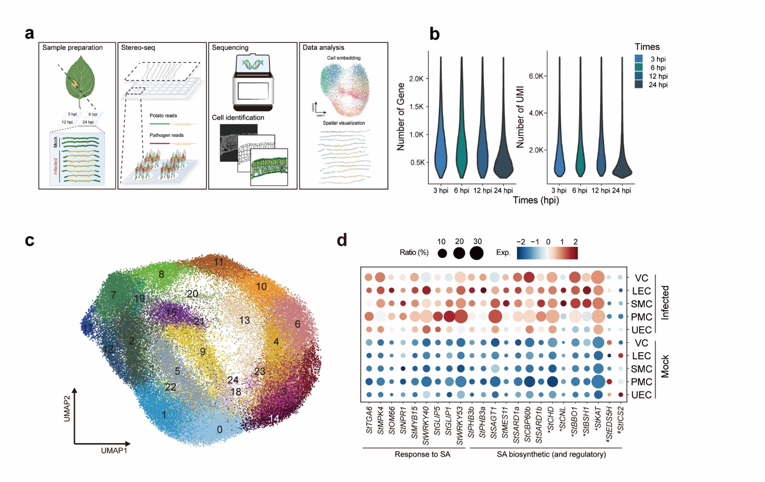 马铃薯作为全球最重要的非谷物作物之一,长期受到晚疫病菌(Phytophthora infestans)的严重威胁,全球每年造成近百亿美元损失。虽然国际学术界和工业界自1845年以来长期开展晚疫病研究,但其致病机理和病程发展模式仍不完全清楚。传统研究晚疫病致病机理多基于组织水平的转录组分析,难以充分揭示细胞异质性和空间协调性。单细胞空间转录组技术为解析晚疫病病程中的精细机制和模型提供了技术突破。