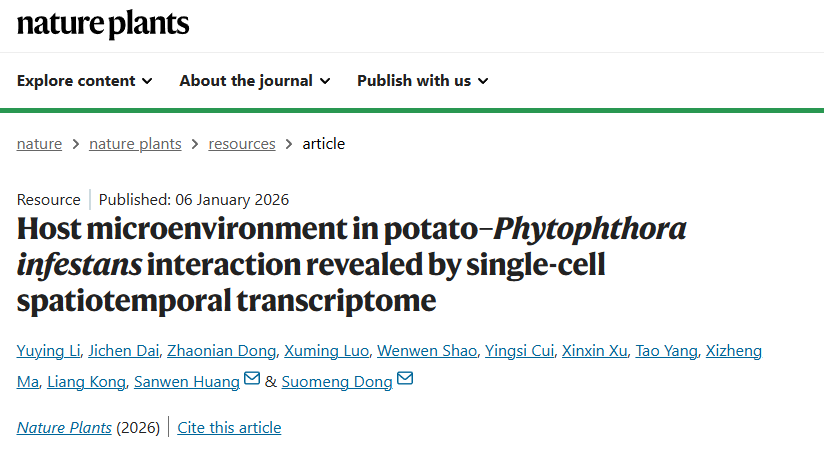 近日,中国农业科学院深圳农业基因组研究所(岭南现代农业科学与技术广东省实验室深圳分中心)黄三文团队与南京农业大学植物保护学院/农林生物安全全国重点实验室董莎萌课题组合作,在《自然·植物(Nature Plants)》上在线发表了题为“Host Microenvironment in Potato-Phytophthora infestans Interaction Revealed by Single-cell Spatiotemporal Transcriptome”的研究论文。该研究利用Stereo-seq空间转录组技术,在单细胞分辨率下解析了马铃薯叶片与晚疫病菌互作的宿主微环境动态变化,鉴定出晚疫病病程中的两类关键的寄主细胞类型:病原靶向细胞(PTCs)与周质细胞(SPCs),揭示了其分别在免疫响应中的功能特点,提出了晚疫病病程新模型。
