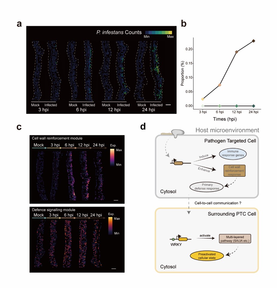 本研究首次在单细胞水平系统揭示了马铃薯-晚疫病菌的互作分子基础,发现了一批可能具有重要功能的基因,提出了晚疫病病程中的关键细胞类型和病程模式,阐明了植物免疫在细胞水平的“分工协作”机制,对在单细胞空间层面理解植物-病原微生物互作具有重要的理论指导意义,为未来抗病作物品种的培育提供了新的靶标和策略。