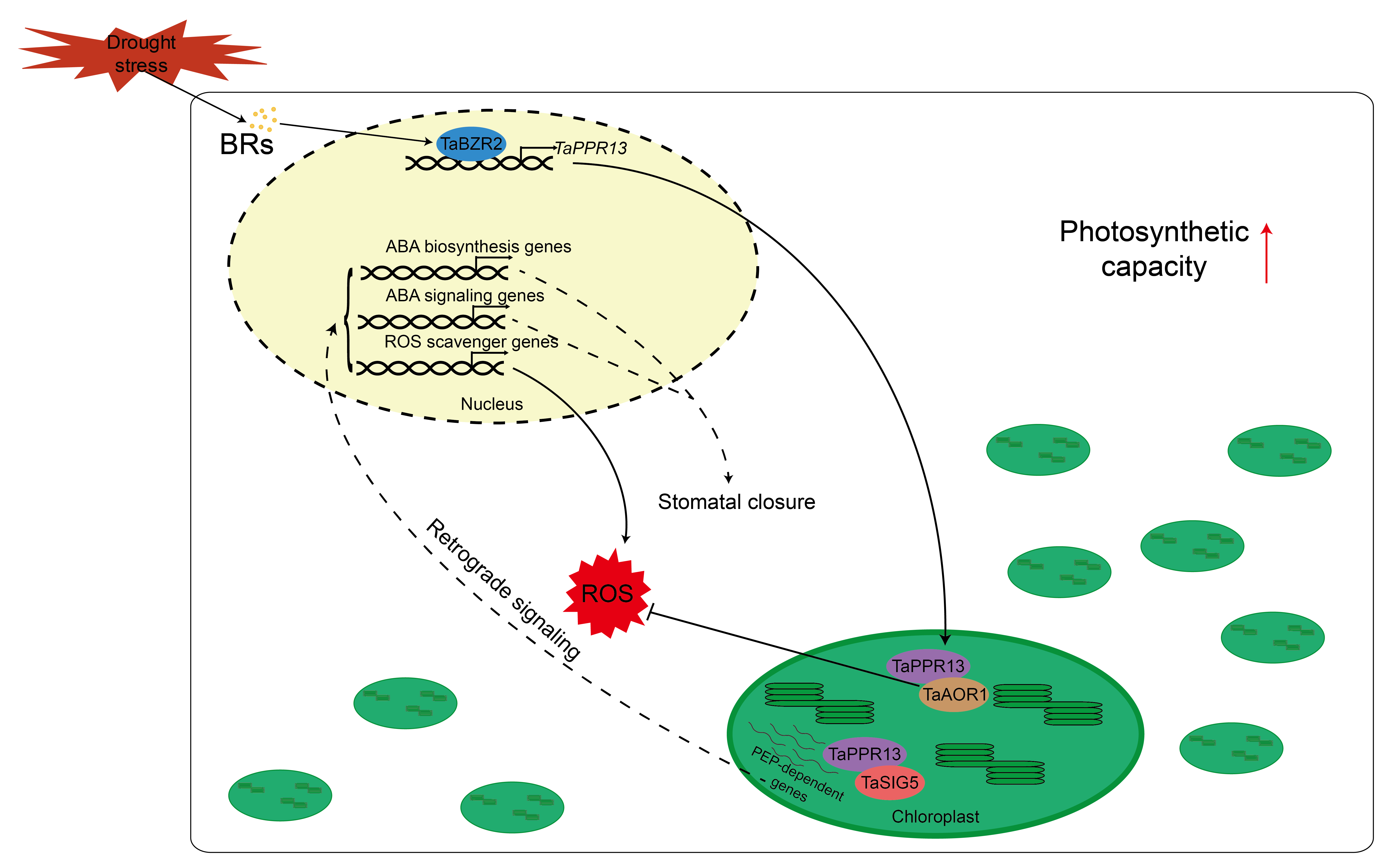 研究团队结合前期研究成果鉴定到一个调控小麦抗旱性关键基因TaPPR13。研究发现,该基因可被TaBZR2激活表达,进而通过调控逆行信号通路增强小麦的抗氧化防御系统。进一步研究发现,该调控过程显著提高了叶绿体编码的光合基因和胁迫响应相关基因的表达,最终诱导气孔关闭来减少水份流失。田间抗旱性鉴定分析发现,过表达TaPPR13基因可提高小麦净光合效率、水分利用效率和单株产量。该研究为小麦抗旱节水育种提供了重要靶点和理论基础。