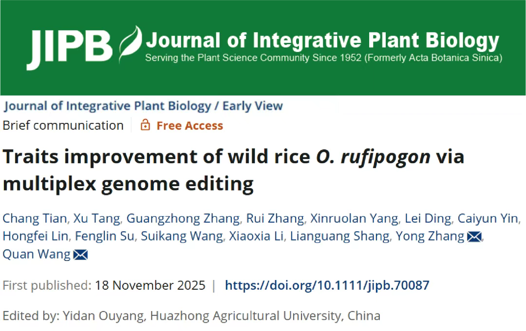 近日,中国农业科学院深圳农业基因组研究所(岭南现代农业科学与技术广东省实验室深圳分中心)汪泉课题组联合西南大学/电子科技大学张勇课题组在《植物学报(英文版)(Journal of Integrative Plant Biology)》上发表题为“Traits improvement of wild rice O. rufipogon via multiplex genome editing”的研究论文。该研究利用基因编辑技术对两种野生稻材料的多个关键农艺性状基因进行改良,解决了野生稻匍匐生长、长芒、易落粒等不利于农业生产的问题。这一成果有助于更好地利用野生稻资源,扩大水稻育种的遗传多样性选择范围,为水稻种质创新与粮食安全保障提供了关键技术支撑。