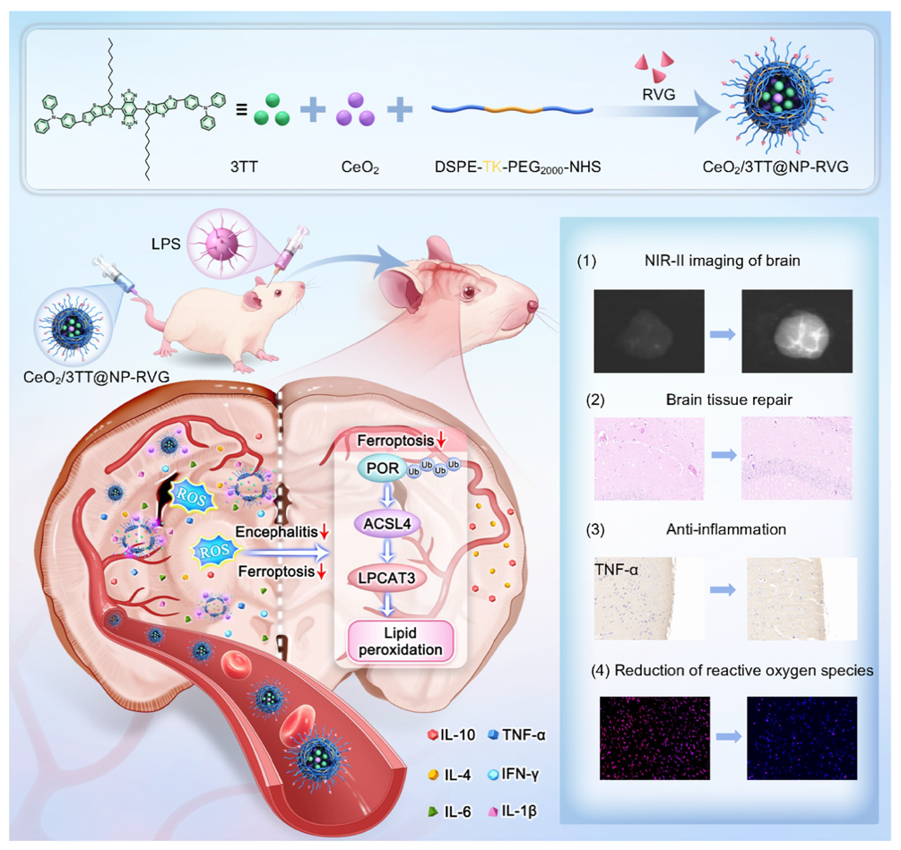 该研究提出了融合分子机制干预与精准成像的诊疗一体化新策略,创新性地构建了CeO₂/3TT@NP-RVG纳米平台。该平台能够实现深组织分辨率下的脑炎实时成像,协同清除ROS、抑制炎症因子(TNF-α、IFN-β),并通过泛素化介导下调POR-ACSL4-LPCAT3通路以抑制铁死亡,从而显著提高脑炎小鼠模型的生存率。