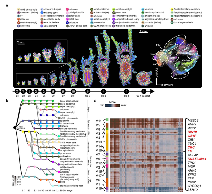 为了深入解析黄瓜下位子房发育的基因表达网络,研究团队对不同发育阶段(S1-S8)的花芽及开花当天的子房组织共52份高质量样本进行了空间转录组分析。成功鉴定并注释了41个来自不同发育阶段的细胞群(clusters),为揭示黄瓜下位子房的发育机制奠定了坚实的基础(图1a)。在植物发育过程中,细胞命运的逐步分化决定了器官的最终形态。借鉴哺乳动物胚胎发育轨迹分析方法,成功构建了黄瓜器官发生轨迹(TOFO)分析方法,精准描绘了细胞命运分化的动态过程:其中花居间分生组织(FIM)分化为花托以及连接组织(花托和心皮的结合处)。结合全基因组联系分析,发现黄瓜果实的主要果肉组织并非来自心皮,而是由花托发育而成,这为黄瓜及其他葫芦科作物的果实改良提供了新的观点和育种策略(图1b)。