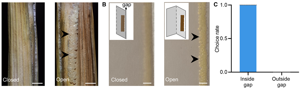 研究人员通过摄像观察到,粘虫通过产卵器鬃毛寻找缝隙,手术切除鬃毛后,雌蛾在缝隙内的产卵率从99.9%暴跌至21.0%,尽管总产卵量未受影响,但由于虫卵大多暴露在开放区域,卵的被寄生率升高了近二十倍。由此,王桂荣团队推测:产卵器鬃毛是东方粘虫雌蛾感知产卵缝隙的关键感器,这些鬃毛通过感知机械压力判断缝隙宽度是否合适。