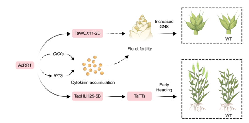 研究团队鉴定到一个冰草穗发育的关键基因AcRR1。在小麦中异源表达该基因可显著增加植株穗粒数,同时对粒重等农艺性状没有任何影响。田间试验显示,相对于对照品种,表达该基因后的小麦产量可提升9.7%-12.3%。进一步研究发现,该基因通过调控小麦小花育性、开花相关基因的表达和幼穗细胞分裂素积累来提高穗粒数、缩短其春化周期、促进早抽穗,进而提高小麦产量和早熟。该研究阐明了冰草AcRR1基因激活小麦产量形成遗传网络的分子机制,为通过导入外源基因来提高小麦产量提供了理论基础和新思路。
