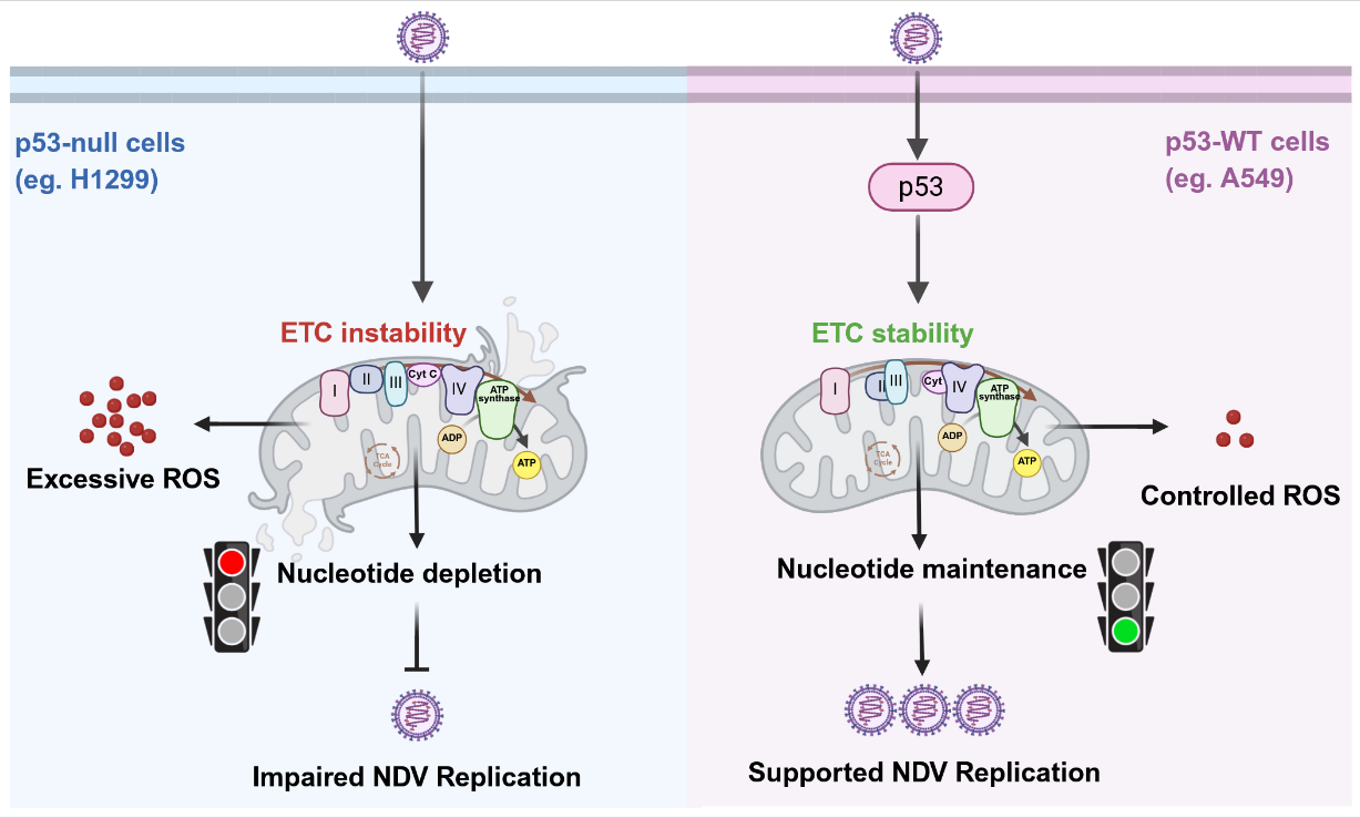 本研究发现,线粒体电子传递链(ETC)主要通过提供天冬氨酸及嘧啶核苷酸合成的前体物质来支持NDV的复制。重要的是,不同细胞对NDV的敏感性差异与其是否携带p53基因密切相关。在机制上,p53在感染过程中发挥着代谢缓冲的“守护者”作用,维持线粒体的稳定性。这一过程被病毒利用,以稳定其复制所需的代谢前体供给。该研究为通过调控线粒体代谢与p53通路来提升NDV的抗肿瘤活性与安全性提供了新的思路,也为溶瘤应用的精准策略奠定了理论基础。