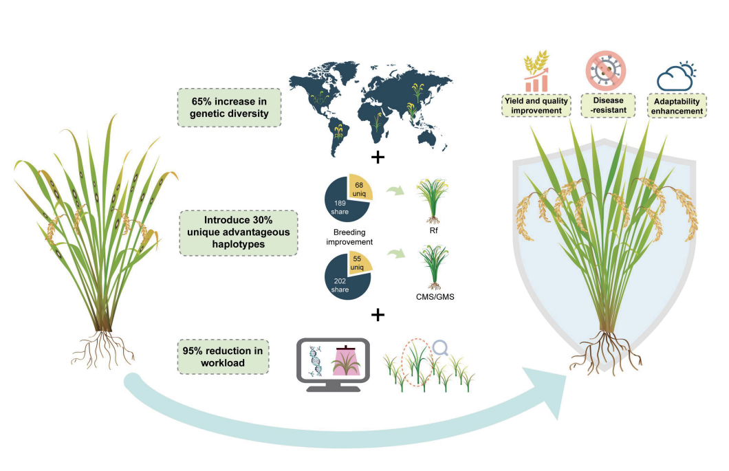 上世纪60年代以来,杂交稻的成功培育为全球粮食安全做出重要贡献。然而长期依赖少数骨干亲本,导致现代杂交稻亲本遗传基础狭窄。同时,尽管现有水稻种质资源丰富,但由于缺乏高效鉴定手段,使得种质资源中的优异等位基因在杂交稻改良中难以利用。这已成为杂交稻育种中的重要瓶颈。